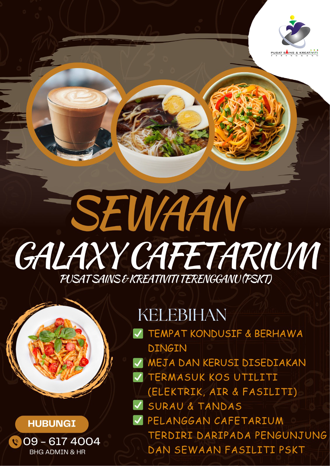 Kami membuka peluang kepada pengusaha makanan dan minuman untuk menyewa ruang Galaxy Cafetarium yang terletak di Pusat Sains & Kreativiti Terengganu (PSKT).